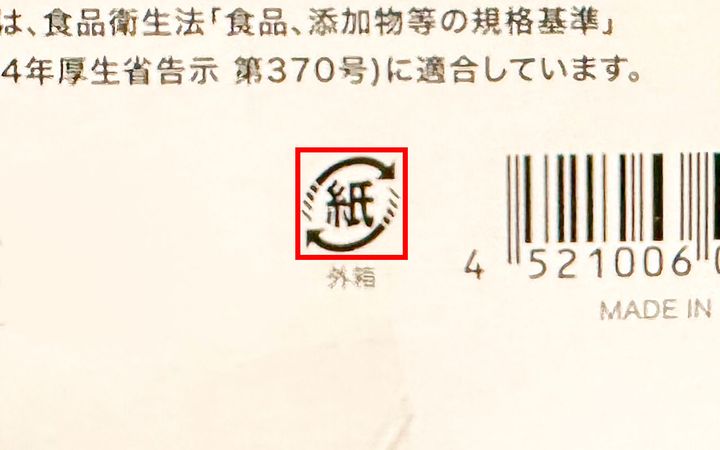 お菓子の箱、包装紙、紙袋など、お茶や野菜ジュースなどのアルミ付き紙容器製品などの、商品を包んだり入れたりしていた紙製の容器や包装に表示されています。