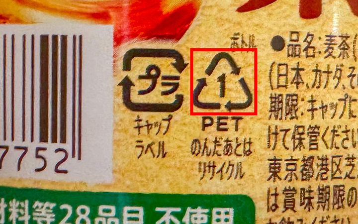 飲料やしょう油等に使用されているペットボトルに表示。プラスチック製容器と区別するためのもの