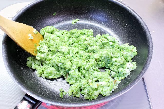 ほうれん草ペーストを全量入れるとご飯がきれいな緑色に!ただ、ペーストが硬いので、ご飯にしっかりと混ざるよう5分ほど炒めました。