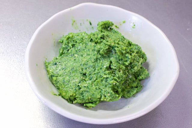上の画像が、混ぜ終わったほうれん草ペーストの様子。もったりとしていて、かすかににんにくの香りがします。