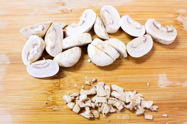 3.マッシュルームの軸をみじん切りに、かさを縦3等分に切ります。