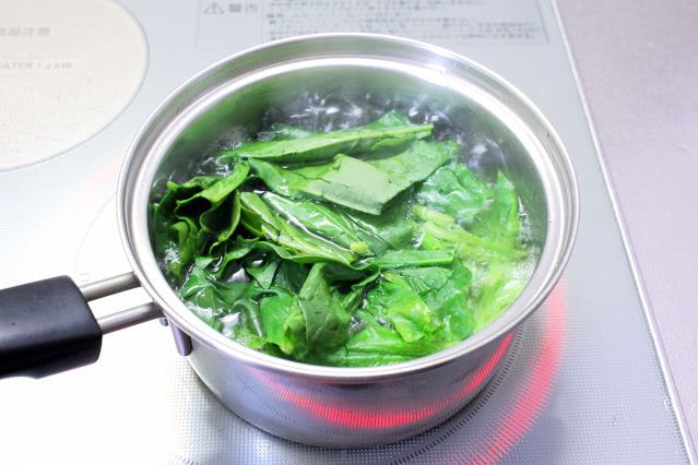 1.ほうれん草を適当な長さに切り、熱湯でさっと茹でたら、冷水に取って水気を絞ります。