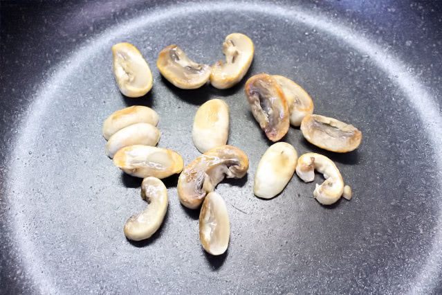 3分ほど炒めたらおいしそうな焼き色が付きました。マッシュルームのかさはトッピングに使うので、お皿によけておきます。