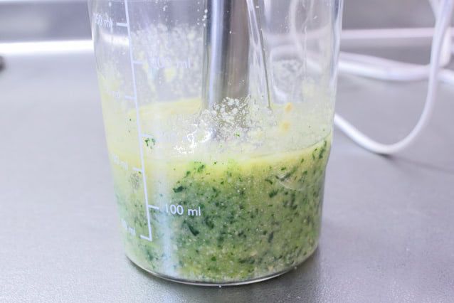 にんにくは粗みじん切りにしてから加えました。ハンディプロセッサーで攪拌しましたが、ねっとりとしていてかなり混ざりにくいです。