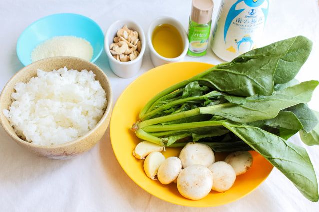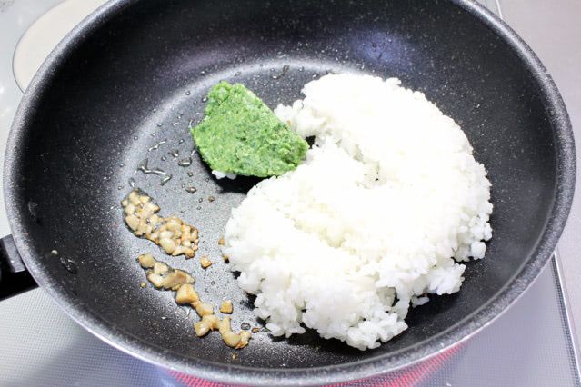 5.4のフライパンにオリーブオイル(分量外)を適量追加して中火で熱し、マッシュルームの軸をこんがりとするまで炒め、ご飯、ほうれん草ペースト、塩を加えて炒めます。