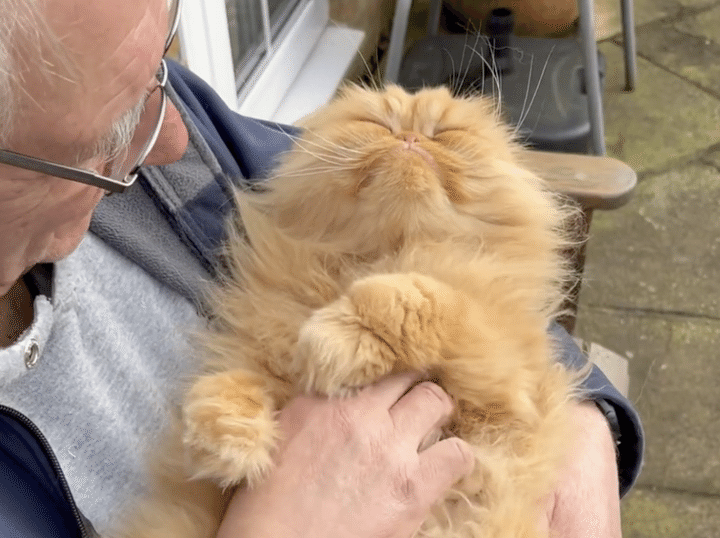 お腹ナデナデに至福の表情♡ 赤ちゃん抱っこが大好きな猫さん。