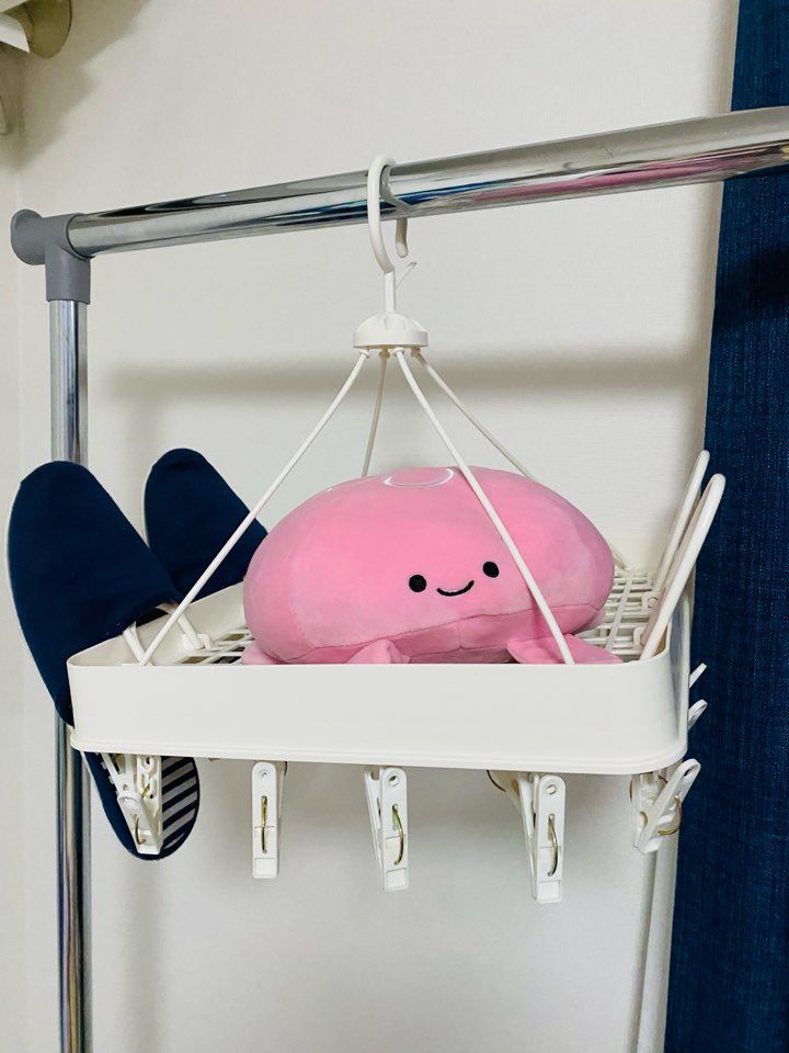 これ何がいいって!同時に平干しも出来て、フックも付いてるから上履きとか靴が干せるんですよね。上履きを洗った後や、ぬいぐるみ洗った後に大いに活躍しそう!