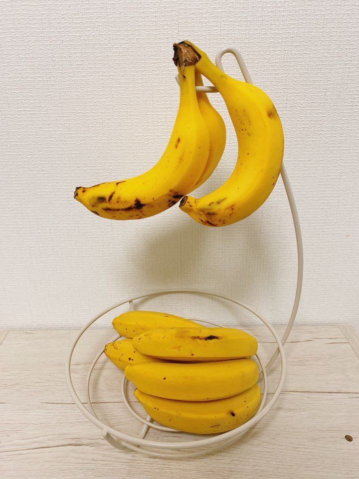 「バナナは地面に触れているところから黒く傷む性質がありますが、スタンドに吊るすことで長持ちさせる効果が期待できます。 木に生えている状態と同じにすることで、置いておくよりも傷みにくいうえコンパクトに保存可能です。」←ネット調べ