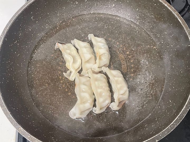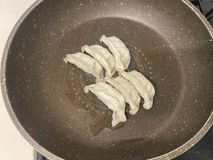 1.  中火で熱したフライパンにサラダ油を引き、冷凍餃子を並べ焼き色がつくまで焼きます。