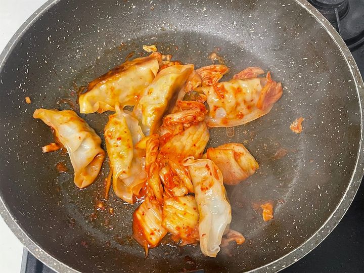 餃子を蒸し焼きにして、キムチと炒め合わせるだけと、超絶簡単に作れました。