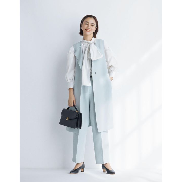 ロングジレ¥39,600 ボウタイブラウス¥19,910 パンツ¥23,100(すべて23区/オンワード樫山 お客様相談室)ピアス¥5,400(アビステ)バッグ¥385,000(ロウナー ロンドン/エイチ アイ ティー)パンプス¥37,400(ロランス/ザ・グランドインク)