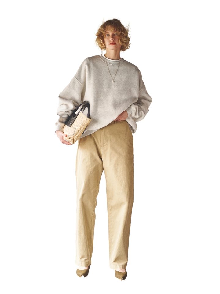 メンズのほうが圧倒的に種類も量も多いチノパン。ウィメンズとは違う、ありあまるほどのぶかっと感がシンプルを変える「いい違和感」として作用。すそからのぞくつま先だけはとがらせてメンズな上下に女らしさをにじませて。