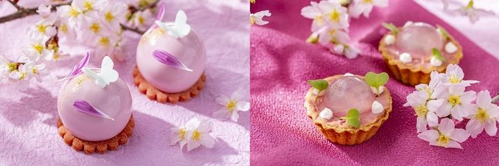 写真左:桜の塩漬けが入ったスコーン(シャンティクリーム、チョコレートソース)/写真右:サクサクのタルトに濃厚な生地、桜香るほんのり甘いジュレを重ねた「桜のフラン」や「赤紫蘇のエクレア」など好奇心を刺激するメニューの数々。高層階からの東京の絶景を眺めながら、淡いピンクでまとめられた芸術的スイーツを(画像:アンダーズ 東京リリース)