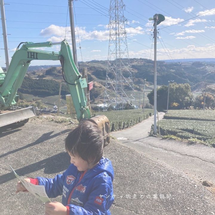 2)お茶畑の脇のショベルカーに子ども達は大興奮