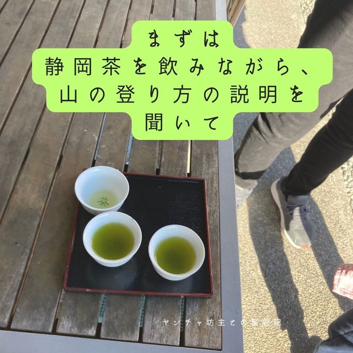 1)東山いっぷく処近くの駐車地に車を停めて、東山いっぷく処でおいしい静岡茶の飲み比べと粟ヶ岳の上り方を教えて頂きます。