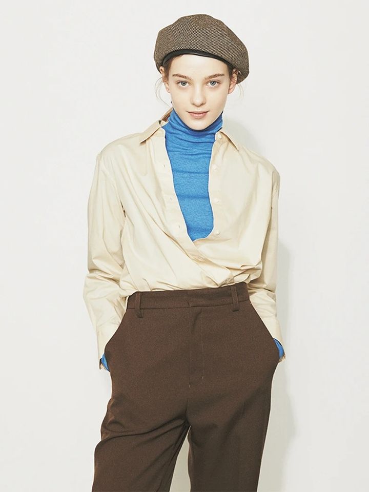 シャツ 2,990円/UNIQLO ブルータートルネックニット 5,990円/UNFILO ベレー帽 11,000円/シャポー ド オー(Chapeau d’ O 東急プラザ銀座店) 茶パンツ 29,700円/ザ ハンサム(UTS PR)