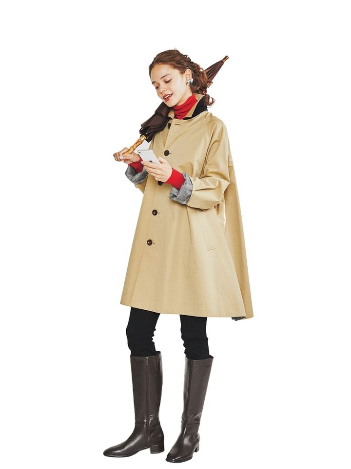 リバ ーシブルコート 85,800円/TICCA 赤タ ートルニット 13,750円/MIESROHE スキニーパンツ 4,990円/UNIQLO イヤリング 16,500円/IRIS47(フーブス) ブラウンロングブーツ(3.5) 33,000円/ワシントン(銀座ワシントン銀座本店) 傘 14,300円/トラディショナル ウェザーウェア(トラディショナル ウェザーウェア ルミネ有楽町店)