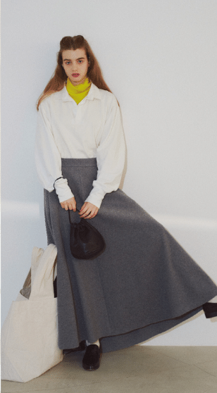 イエローハイネックトップス 10,450円/THE SHINZONE(Shinzone ルミネ新宿店) 白ラガーシャツ 24,200円/アンド アールシー(カレンソロジー 青山) グレースカート 86,900円/ATON(ATON AOYAMA) 白ソックス 3,850円/leur logette(ブランドニュース) 黒バッグ 17,050円/FILL THE BILL(フィル ザ ビル マーカンタイル 青山) トートバッグ 28,600円/ソリッドアンドストロング バッグ ストア ローファー 17,930円/A de Vivre