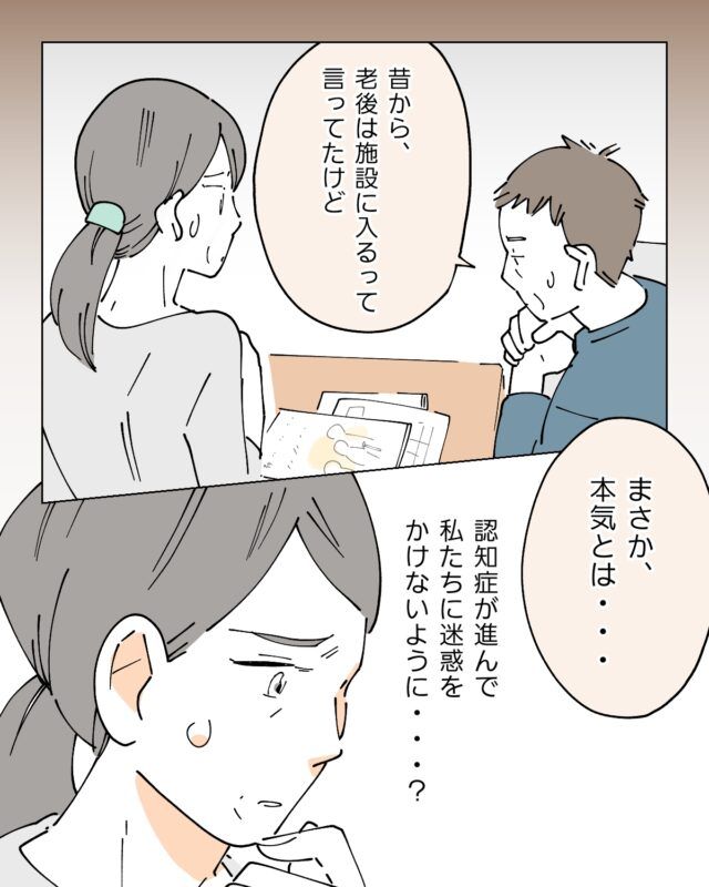 体調が悪くなった義母に「だれ!?知らない!」と言われショックで涙を流したカスミさん、でも「お義母さんは何も悪くない」と感じていたある日のこと、シンゴさんから義母が介護施設のことを調べているみたいだと聞いて・・