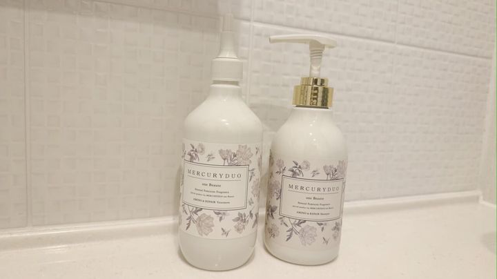 ボトルも、MERCURYDUOらしい繊細なタッチの花柄と英字デザインがおしゃれすぎる。ゴールドのワンポイントも上質感たっぷりだし、いい意味でヘアケア製品っぽくなくて、インテリアになじみます。