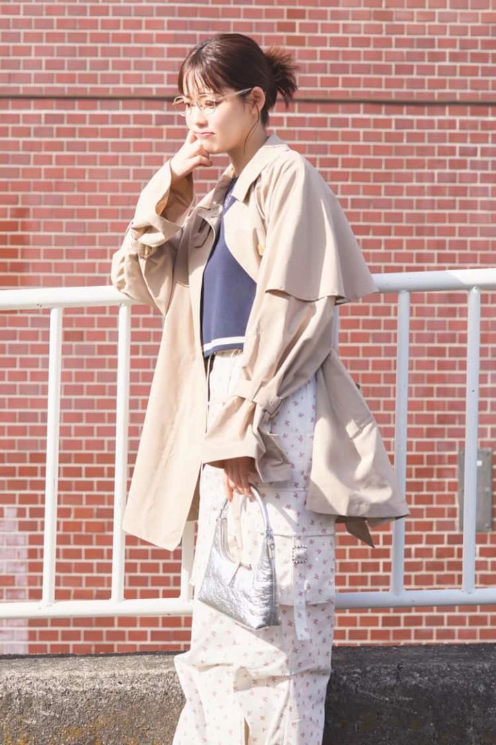 トレンチコートは着回し。ラインセットアップ(トップスのみ使用)16,500円/31 Sons de mode(ヒロタ)小花柄ワークパンツ 20,680円/lilLilly TOKYO めがね 20,000円/OWNDAYS シルバーバッグ 35,893円/MARGESHERWOOD(MUSINSA GLOBAL STORE)