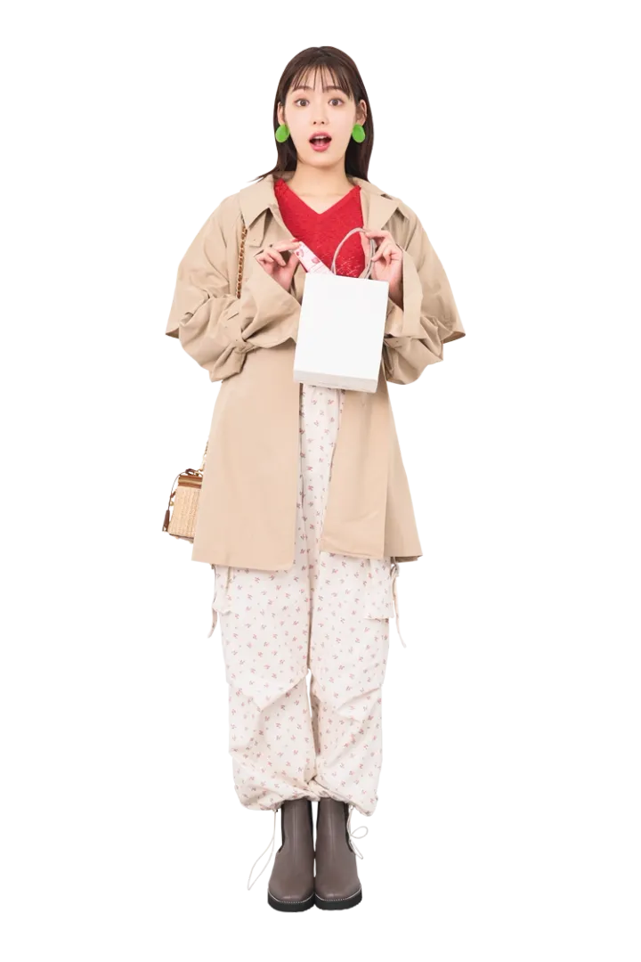 トレンチコートや小花柄パンツで、春っぽさを意識♡ トップスはトレンドカラーの赤ニットをチョイス!