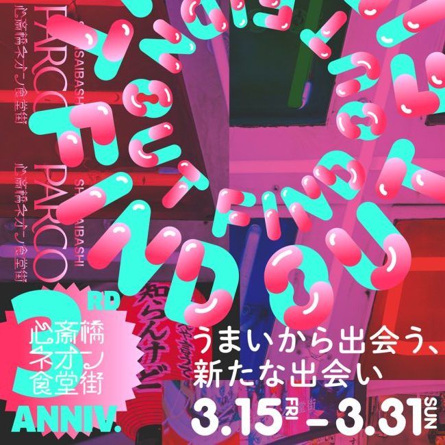 3月にオープン3周年を迎える心斎橋パルコ地下2階「心斎橋ネオン食堂街」。これを記念したイベント「FIND OUT」を開催します。期間中は「新しいモノ・コト・ヒトとの出会い」をテーマに、「カレー⼤作戦」や「〆コーヒーのすゝめ」といった企画のほか、同⾷堂街のInstagramをフォローすると、各店のスペシャルメニューが300円で提供される「300円いーね!」なども予定。素敵なモノが見つかりそうな「マーケットイベント」も見逃せません。