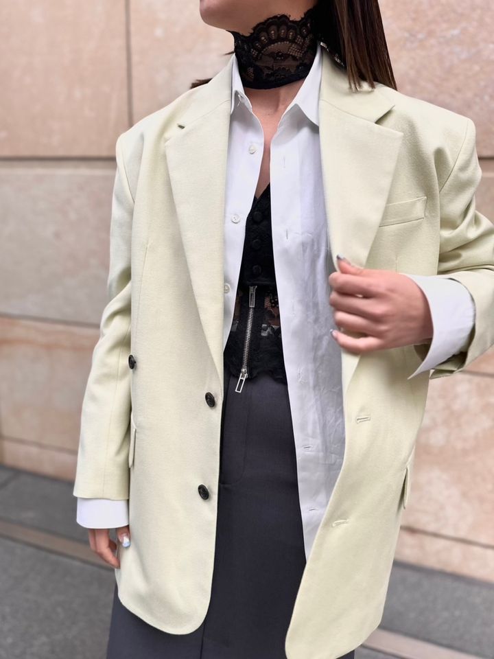 「春のムードを感じるライトグリーンのジャケットを主役にスタイリング。インナーには白シャツとレースのベストをレイヤードして奥行き感を出しました。ベストはチョーカーのように見える首元のデザインもポイントです。レースの透け感やデコルテのさり気ない肌見せでヌケ感を作り女性らしいバランスを意識しています」