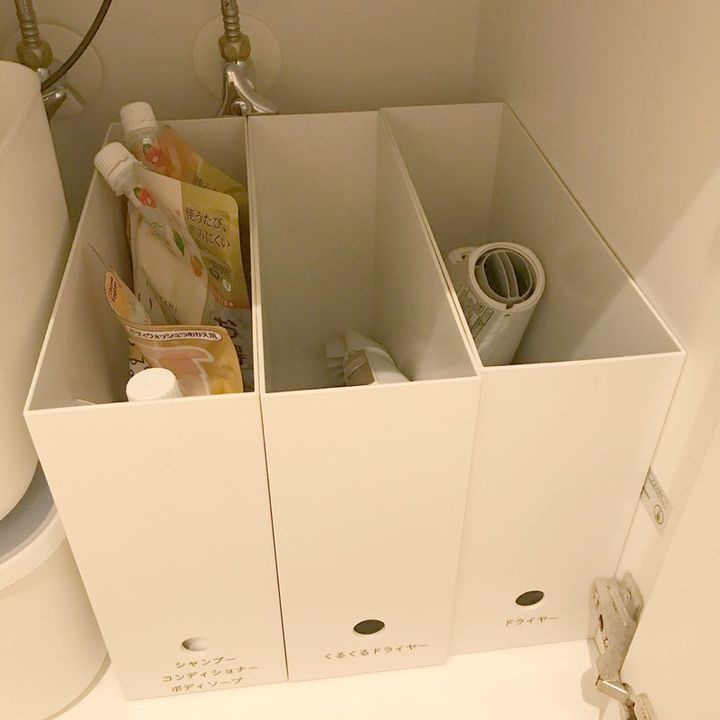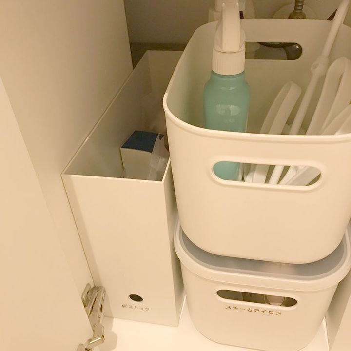 配管のある所にはファイルボックスは奥行が足りなくて置けないため、やわらかポリエチレンケースを利用しています^^別売りの蓋を使用することで、積み重ねることもできます♪