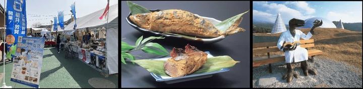 「へしこ」「越前おろしそば」「焼き鯖寿司」「水ようかん」など、福井県の食文化が楽しめる物産品販売のほか、福井県坂井市・美浜町などによる観光案内ブースの出展、福井県公式恐竜ブランドキャラクター「Juratic(ジュラチック)」ラプト君のグリーティングなども予定されています。また福井県観光案内ブースにて「観光に関するアンケート」回答すると、各日先着150名にノベルティとして「若狭塗り箸」がプレゼントされます。