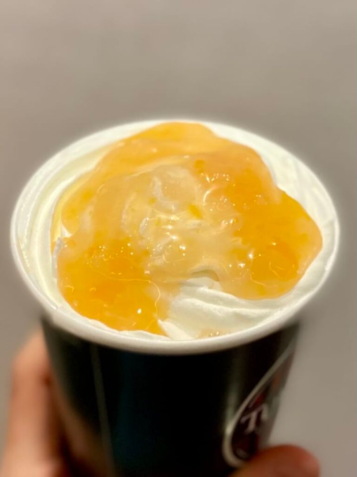 飲んでみると、アーモンドミルクで仕上げられたあっさりした甘さのロイヤルミルクティーに、桃や杏のフレッシュでみずみずしい甘さが際立っています! とってもジューシーで、ごろっとした果肉感もたまりません。全体的にまとまりがよく、素材同士が互いのおいしさを引き立て合っています。リピート確定のメニューですよ♪