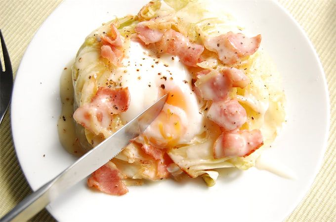 8.  焼き上がったキャベツをお皿に盛り付け、ベーコンとにんにく、卵をトッピングします。