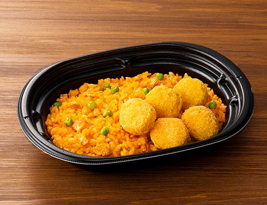 チキンライスに「海からクン」のエビタルタル味をのせたお弁当。一口サイズのエビのナゲットが楽しい一皿です。