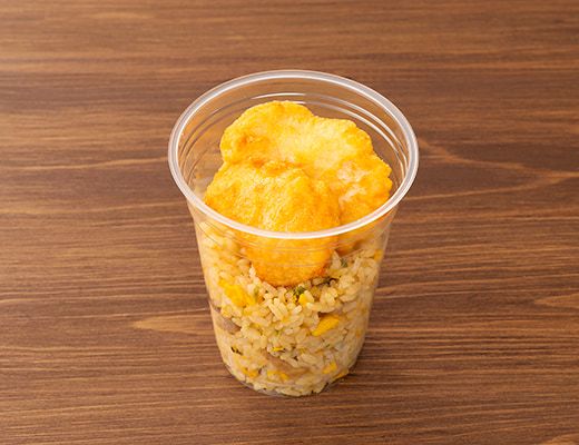 カップにチャーハンに桜島どりから揚げをトッピング!スプーンでいつでも手軽に食べられるカップ容器に入れたごはんです。