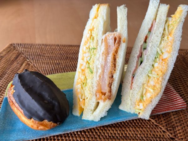 人気のサンドイッチ「ミックス(右・250円)」と「海老カツ(真ん中・250円)」と「エクレア(左・220円)」も購入。一緒に並べるととても華やかです。
