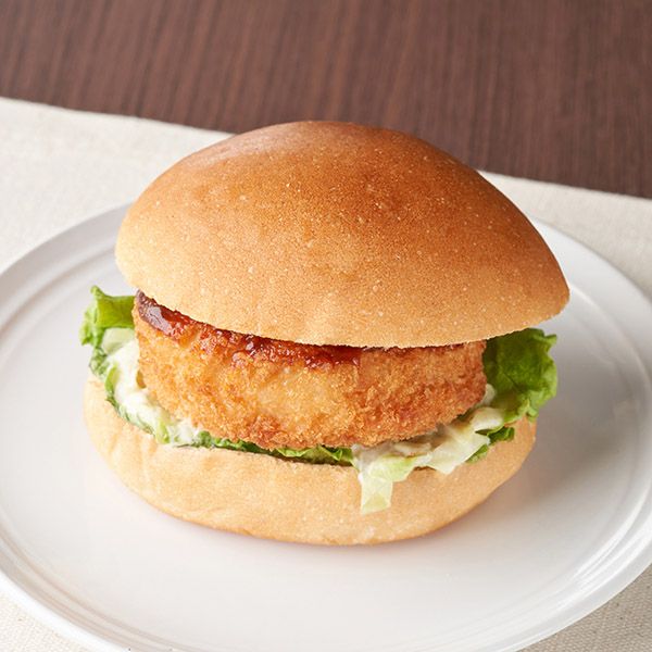 バンズに挟んであるのはグラタンコロッケ! とろ〜り食感がポイントです。そこに合わせているのはデミグラスソースやキャベツのマヨネーズ和え。食べやすいバーガーは忙しいときにもうれしいかも!