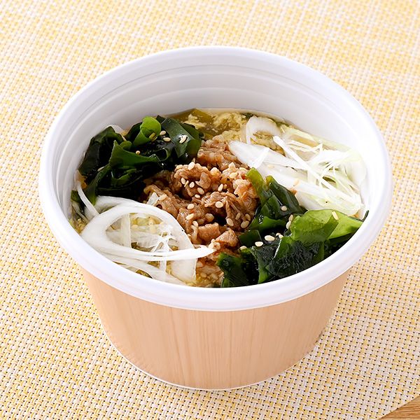牛肉のトッピングがうれしい「わかめと玉子のクッパ風スープ」。牛の旨みとごま油の風味がきいたクッパ風スープに雑穀・わかめ・玉子・牛肉・ねぎが入っています。単品はもちろんほかのメニューと合わせても◎!