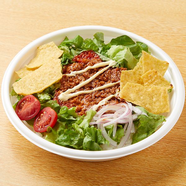 プラントベースドミートのブランドである『ザ・ベジタリアン・ブッチャー』監修のタコライスは植物性肉を使用しています。もちろんミニトマトやグリーンリーフなどの野菜もたっぷり! 白ワインビネガーを使用したトマトのソースでさっぱりいただきましょう。