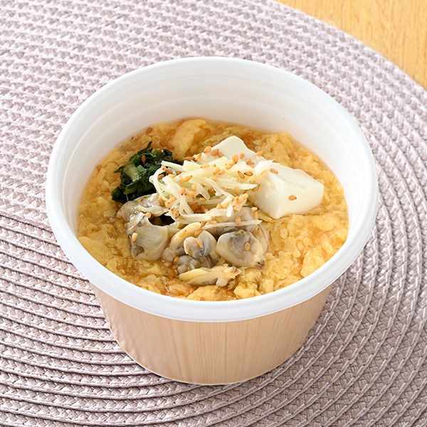 かつお節やあさり、鶏の旨みがきいたスープに押し麦・玉子あん・豆腐・あさり・しそ高菜をトッピングしました。