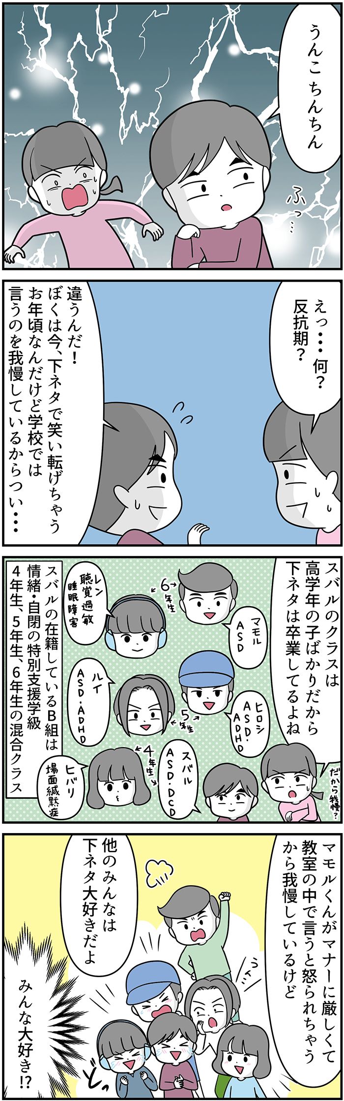 ASD(自閉症スペクトラム)の小学生・スバルくんのカラフルな日常を描きます。今回はスバルくんたちも大好きな下ネタについてです。