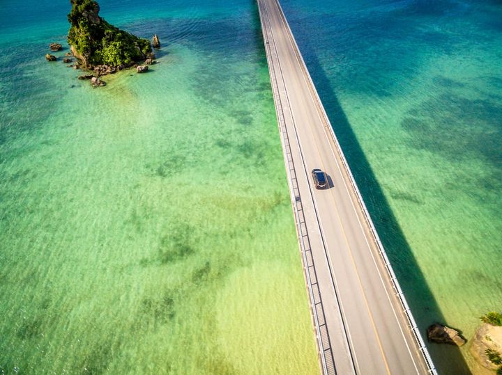 沖縄といえば思い浮かぶのが、青い空、青い海。そんな海と空を存分に味わえる絶景スポット、古宇利島(こうりじま)。古宇利島へは、古宇利大橋(こうりおおはし)を使って渡るのですが、この橋がまた絶景ドライブを存分に味わえる魅力のスポットなのです。