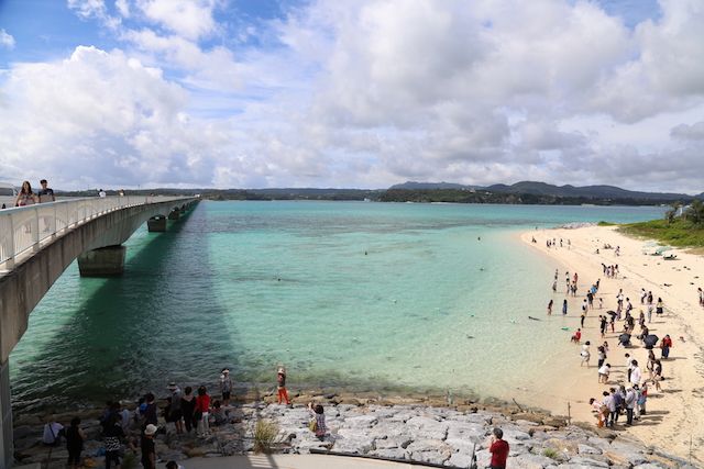車だと約10分で一周できてしまうほどの小さな島ですが、島にはカフェやレストラン、宿泊施設も充実。古宇利大橋のすぐ横にはビーチもあり、たくさんの人で賑わっています。ビーチからは渡ってきたばかりの橋を望むこともでき、海に架かる橋を眺めるのも、何とも言えない絶景です。