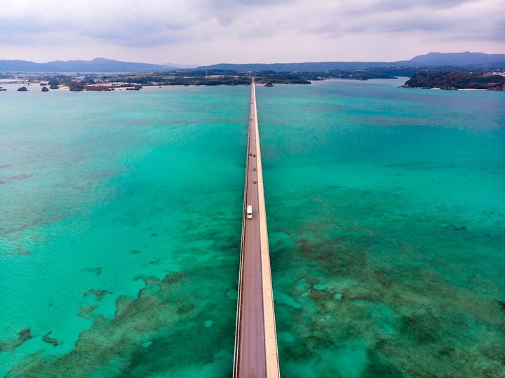 そして長さ1,960メートル、海の上を一直線に伸びる古宇利大橋から見る海! まるで海の上を走っているような気分。エメラルドグリーンの美しい海を360度見渡すことができます。