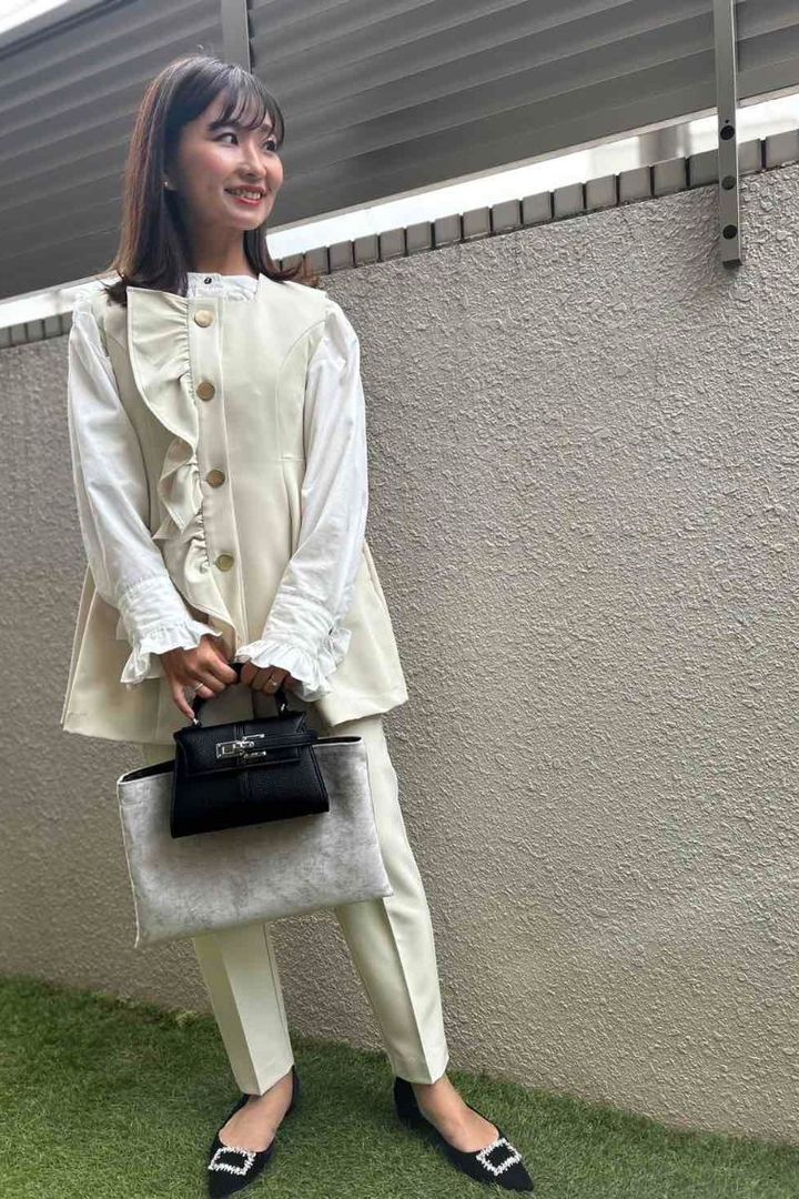 「入園式は明るく華やかなイメージで行きたいと思い去年の秋頃からネットで探し始め、白のパンツとジレのセットアップを買いました。先輩ママにジャケットなしの人もいるよ!と聞いて、手持ちのブラウスだけだと少しカジュアルすぎるので、ジャケットほど堅苦しく見えないジレを着ることに。フリルと大きめなマットゴールドのボタンがポイントになり、特別目立つアクセサリーやブローチを付けなくても華やかに見えるので小ぶりのピアスのみの予定。ジレのフリルは取り外しができるのもお気に入りです」坂井麻実さん・36歳(3歳女の子ママ)