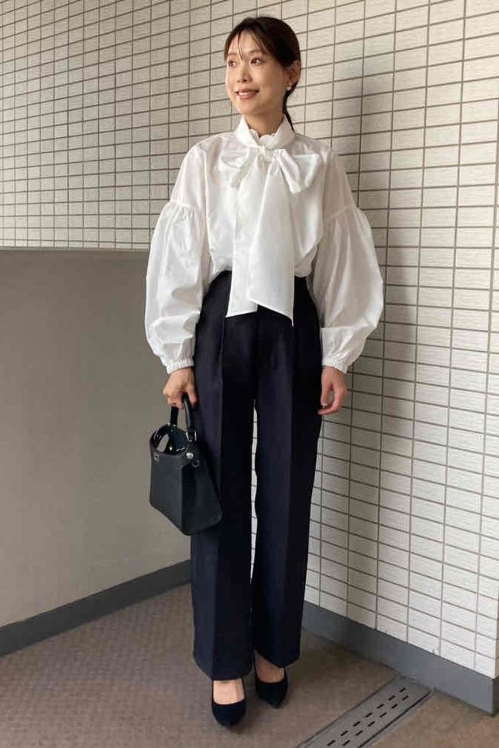 「今年は、卒園・入学・入園とトリプルセレモニーなんです。ポップアップVERYでオーダーしたリボンタイがポイントのブラウスがコーデの主役! 取り外しもできるので、着回しが利くのもポイントです」細川美沙都さん・33歳(3歳と6歳男の子ママ)