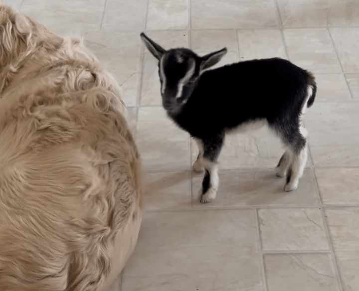 3. 小さな子ヤギをお世話してくれる、優しいゴールデンレトリバーさん。