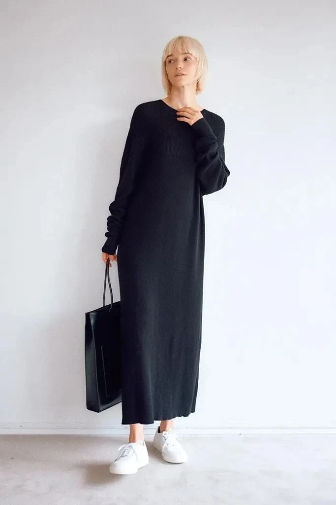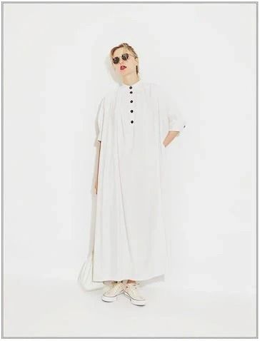 ボディラインを拾わない余白が特徴。真っ白なスニーカーや角ばったレザーバッグなど、シンプルながらポイントになる小物をおさえて、脱ベーシックへ。適度に抜けたネックラインも、足首までの長さの四角いフォルムとたるんだそでの重みによって、寒々しく見える心配はなし。