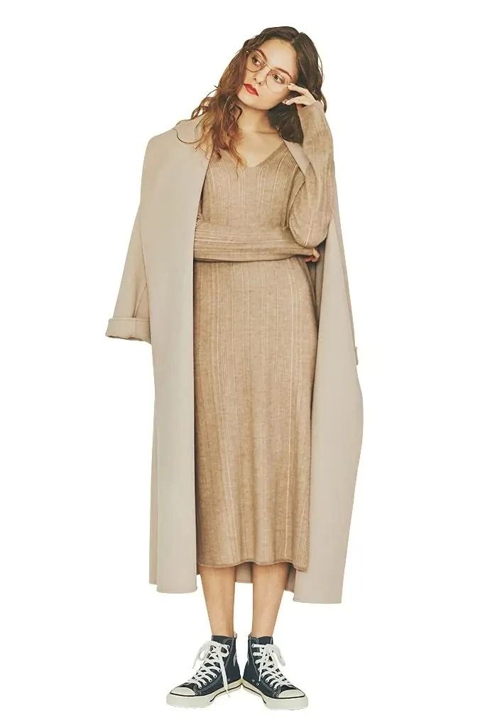 コートとワンピースのコンサバなムードを裏切るスニーカー合わせ。足首がのぞくおかげで長いものどうしをかけ合わせてもラフに転ばない。