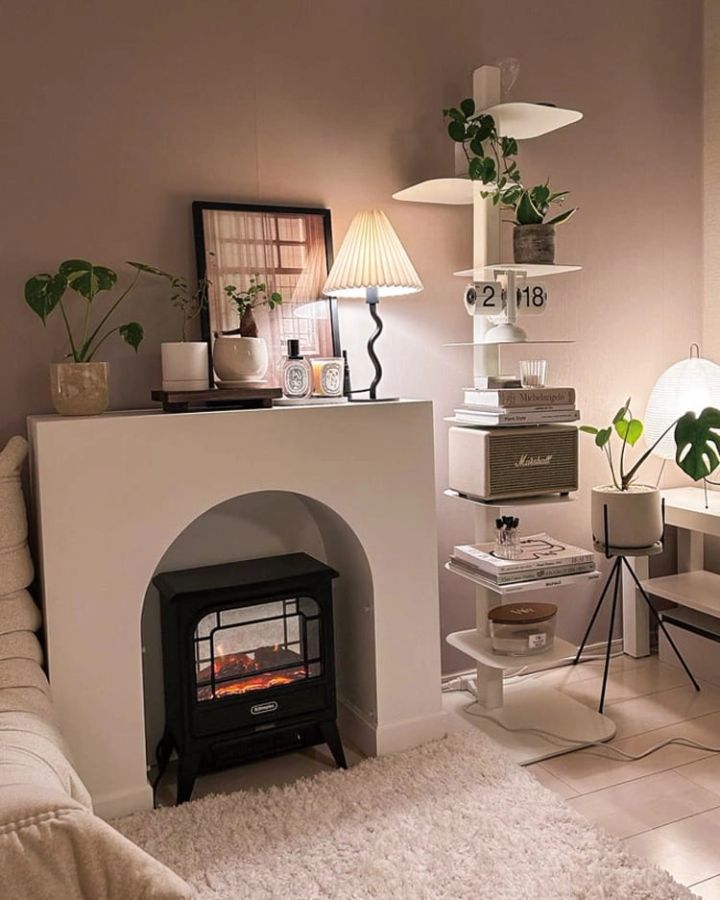 マントルピースはPOPROOMで購入。電気暖炉は本物のように火が揺らめいて、癒される電気ストーブです。