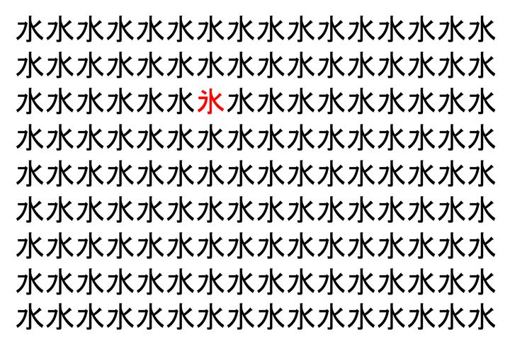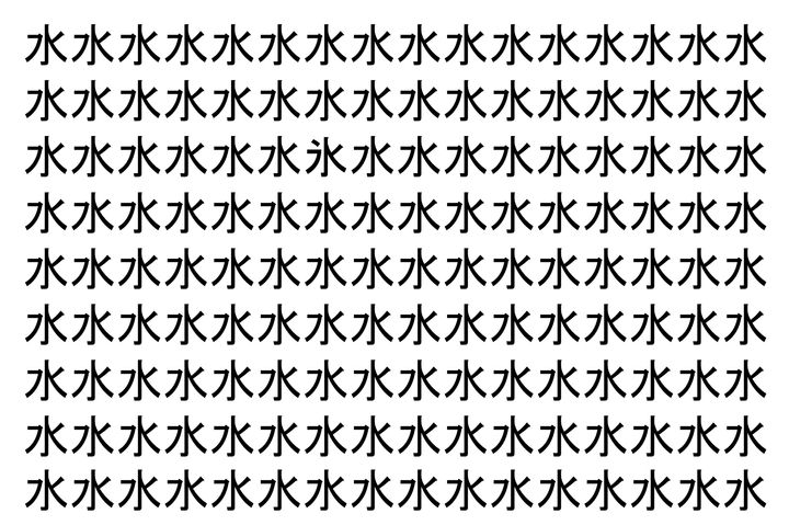 画像の中には、「水」という漢字が縦に9行、横に16個並んでいます。 全部で144個となりますが・・・、そのうち1つは「異なる漢字」となってますよ!!